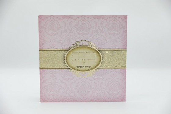 כריכה קשה מעוטרת עם טקסטורה דמוי תחרה בגוון ורוד עדין, המשדרת יוקרה ואלגנטיות.